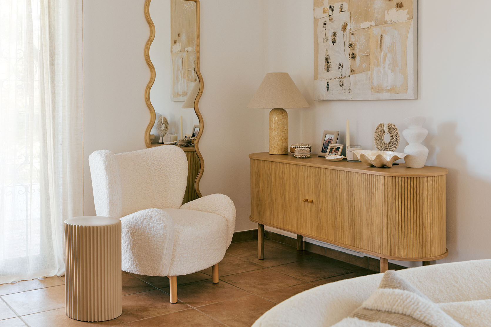 Scopri CALARY: la serie comprende tavoli da pranzo, credenze, scrivanie e altro ancora, tutti realizzati con legno certificato FSC® proveniente da fonti responsabili. L'elemento chiave di questo design sono i frontali scorrevoli in legno scanalato, che conferiscono ad ogni mobile un look speciale. Grazie al suo design versatile, CALARY si adatta perfettamente a qualsiasi stile! Il prodotto ha due ante scorrevoli, due scomparti e un passacavi sulla parete posteriore. Made in Europe