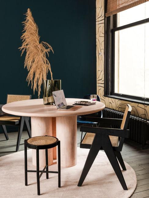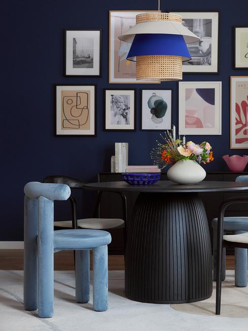 Per finire, ecco l’accostamento che forse non ti aspettavi: abbina le tue pareti verde petrolio con arredi in colore blu. In questo caso, crea un sottile gioco di sfumature usando tante gradazioni diverse di blu, dal carta da zucchero, all’azzurro polvere fino al cobalto. Noi lo abbiamo immaginato nella zona salotto, con un divano in velluto blu notte completato da cuscini in fantasia abbinata e un tappeto chiaro in corda.