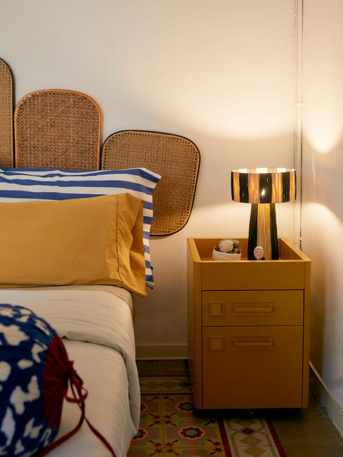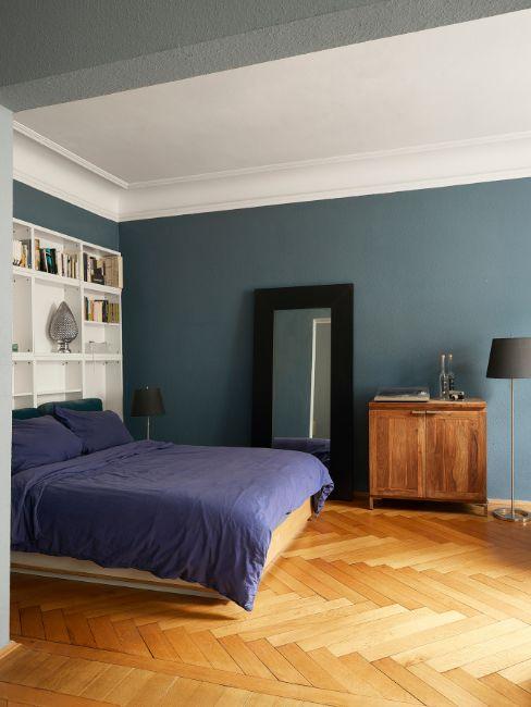 Per portare un pizzico di glamour e mistero alle pareti della camera da letto, dipingi una o più pareti in verde petrolio. Potrai poi alleggerire lo spazio usando un colore chiaro a contrasto e una texture metallica. Vuoi un esempio a cui ispirarti? Applica il colore solo sulla parete dietro la testiera e scegli un letto con rivestimento in tessuto beige; completa con piccoli accenti dorati per illuminare la stanza, come un grande specchio decorativo e un lampadario a sospensione.