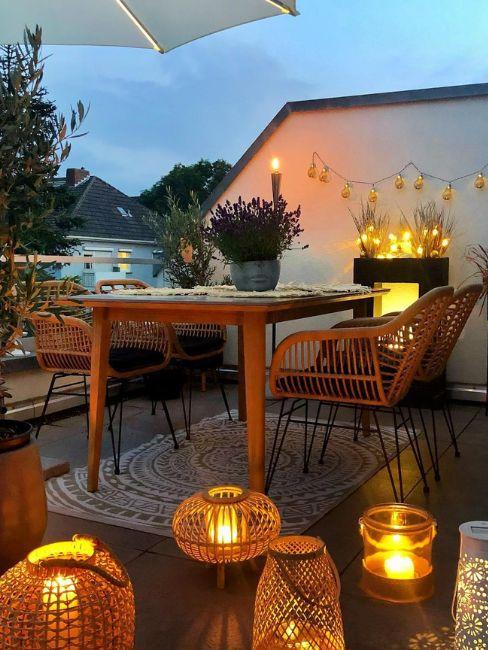 Per vivere al massimo il tuo terrazzo quando scende il sole, illuminalo in modo strategico. Meglio preferire le lampade solari o a batteria, che non richiedono l’intervento di un elettricista. Per le serate speciali, usa candele LED da appoggiare sul tavolo, lanterne e catene luminose che renderanno tutto più magico.