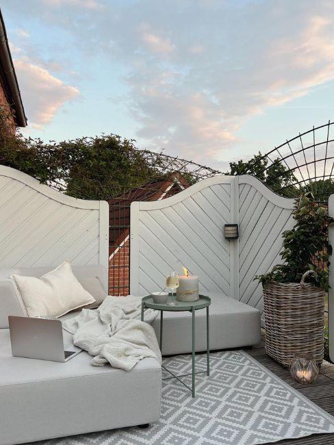 Sotto il tavolo o nella zona salotto, stendi un bel tappeto da esterno, meglio se in colore scuro. Opta per una fibra sintetica, facile da pulire e che non si rovina con la pioggia o il sole.