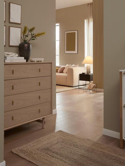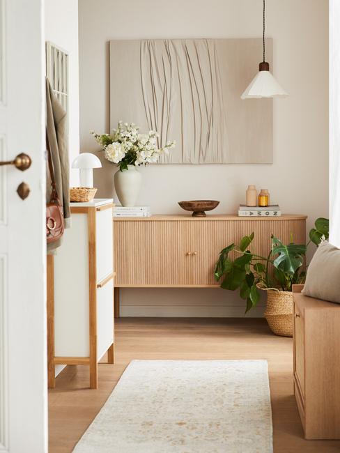 In caso di disimpegno “mini” tra una stanza e l’altra, l’imperativo è ottimizzare. Una cassettiera? Perché no! E non dimenticare un vaso che attiri lo sguardo e una stampa o un quadro per movimentare il muro.
