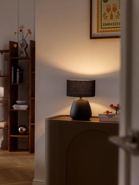 Vuoi donare un accento contemporaneo a un angolo spoglio? Utilizza una madia in legno con ante, stile Mid century, e abbina qualche pezzo iconico in colori a contrasto. Una lampada moderna con forme rigorose, uno svuotatasche accattivante e un quadro originale alla parete faranno miracoli.