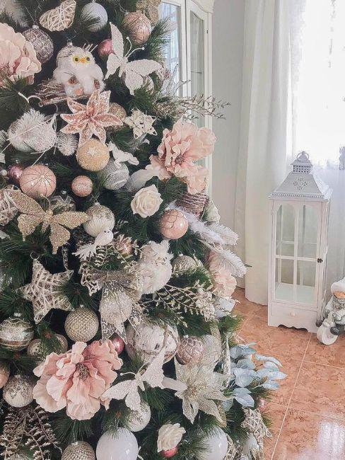 Se il rosa ti tenta, ma non vuoi allontanarti troppo dalla tradizione, questo abbinamento è quello che fa per te. Prendi un albero classico oppure bianco (puoi utilizzare quello che già possiedi), illuminato da luci di un bel tono bianco caldo, e appendi un mix di addobbi in oro e rosa tenue o rosa acceso. Per un effetto esagerato, riempi con tantissimi fiocchi e fiori artificiali ton sur ton in modo che non si vedano quasi i rami.