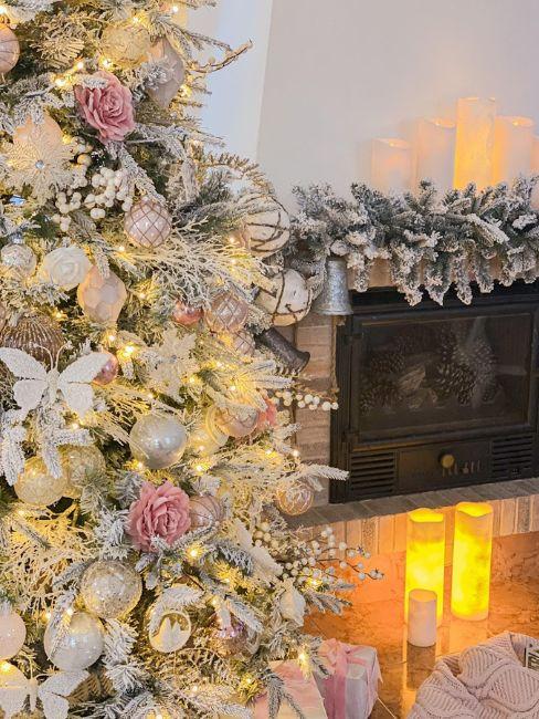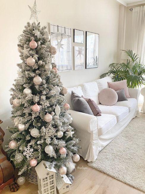 Un modo alternativo per allestire un albero di Natale rosa è usando un abete artificiale bianco e decorandolo con addobbi rosa. In questo modo, avrai una base versatile per cambiare ogni anno il tema. Puoi anche aggiungere ornamenti bianchi per creare ulteriore contrasto, come fiocchi di neve, fiori finti e anche sfere in vetro.