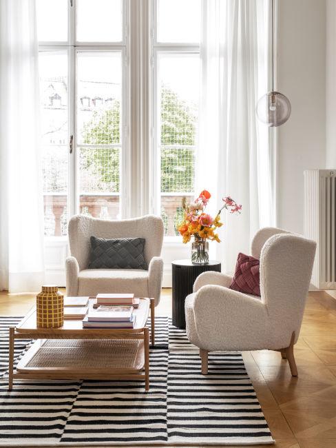 Soggiorno di design all'avanguardia di Barbara Sturm con due vasi di design sul tavolino da caffè lucido.