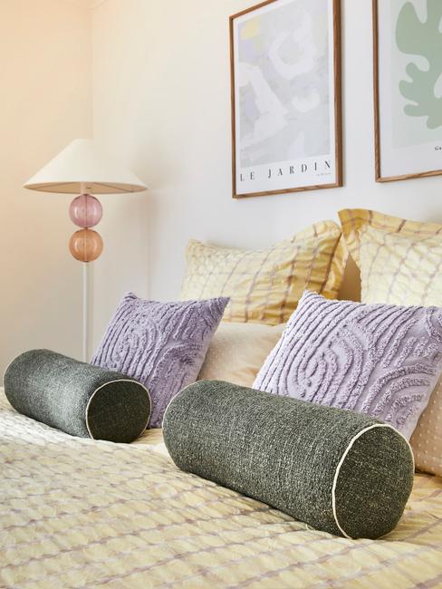 Giardino in stile boho con candele, poltrone con cuscini chiari e tavolini in legno
