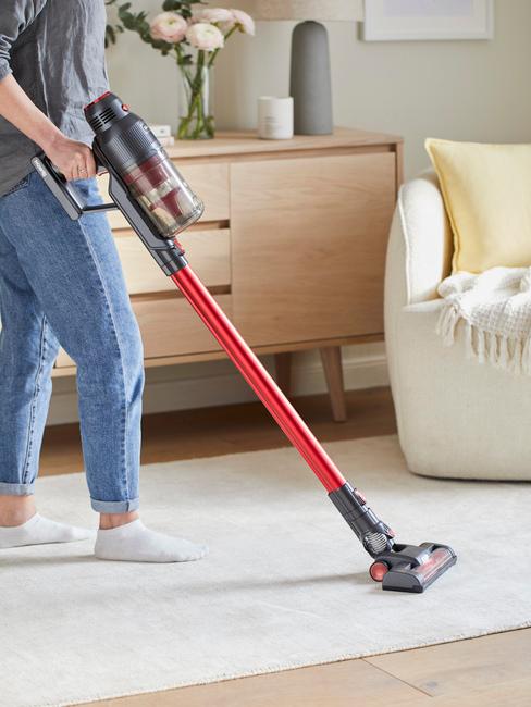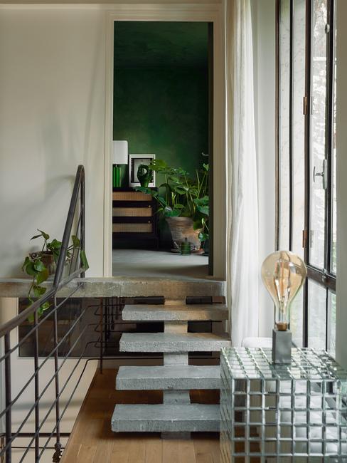 Scaffale con contenuto relativamente piccolo e semplice accanto a una sedia con cuscini