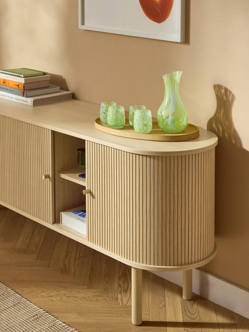 Una madia di design cannettata in soggiorno diventa subito un elemento che cattura l’attenzione. Le scanalature catturano la luce e valorizzano accessori decorativi come vasi e lampade.